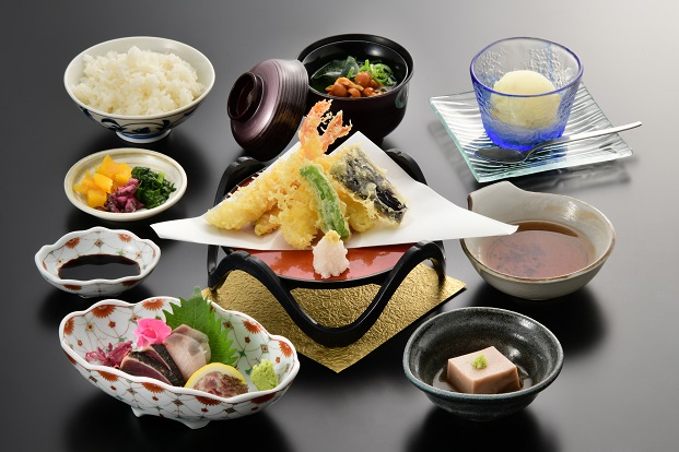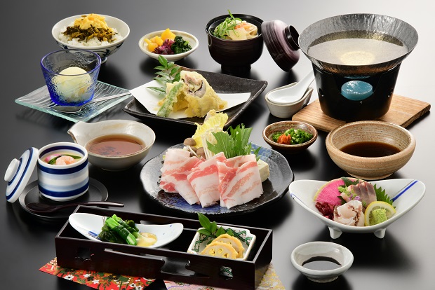 うまかばい御膳 郷土二種盛(一文字ぐるぐる、辛子蓮根)/天草産お造り二種盛/肥後なすの肉巻き天ぷら/あそび豚のしゃぶ小鍋/高菜ご飯/だご汁/漬物/茶碗蒸し/デザート お一人様 4,000円 (税込) ルームキーのご提示で4,200円(税込)が右記価格に!