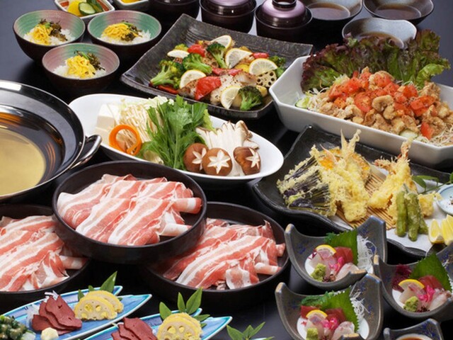 大皿コース Bプラン ■炙りベーコンサラダ ■お造り三種盛り ■国産牛のしゃぶしゃぶ小鍋 ■白身魚と野菜のオーブン焼き ■油淋鶏 ■塩焼そば ■春雨スープ ※写真はイメージです。 仕入れにより内容を変更する場合もございます。 お一人様 7,000円 (税込)