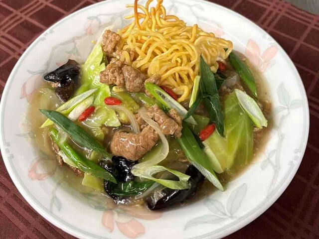 醤油味のスープにとろっと煮込んだ牛バラ肉をかけた一品です。