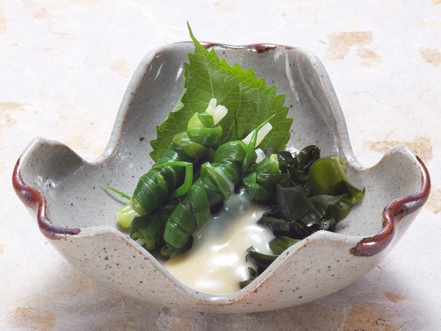 ネギの一種(わけぎ)をさっと茹でて、白い根の部分を芯にして葉の部分をぐるぐると巻きつけ、酢味噌で食べる料理です。