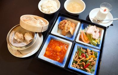 松花堂弁当(蒸し鶏サラダ、チンジャオロース、海老チリソース煮、唐揚げ/春巻き)点心2種、ライス、コーンスープ、杏仁豆腐